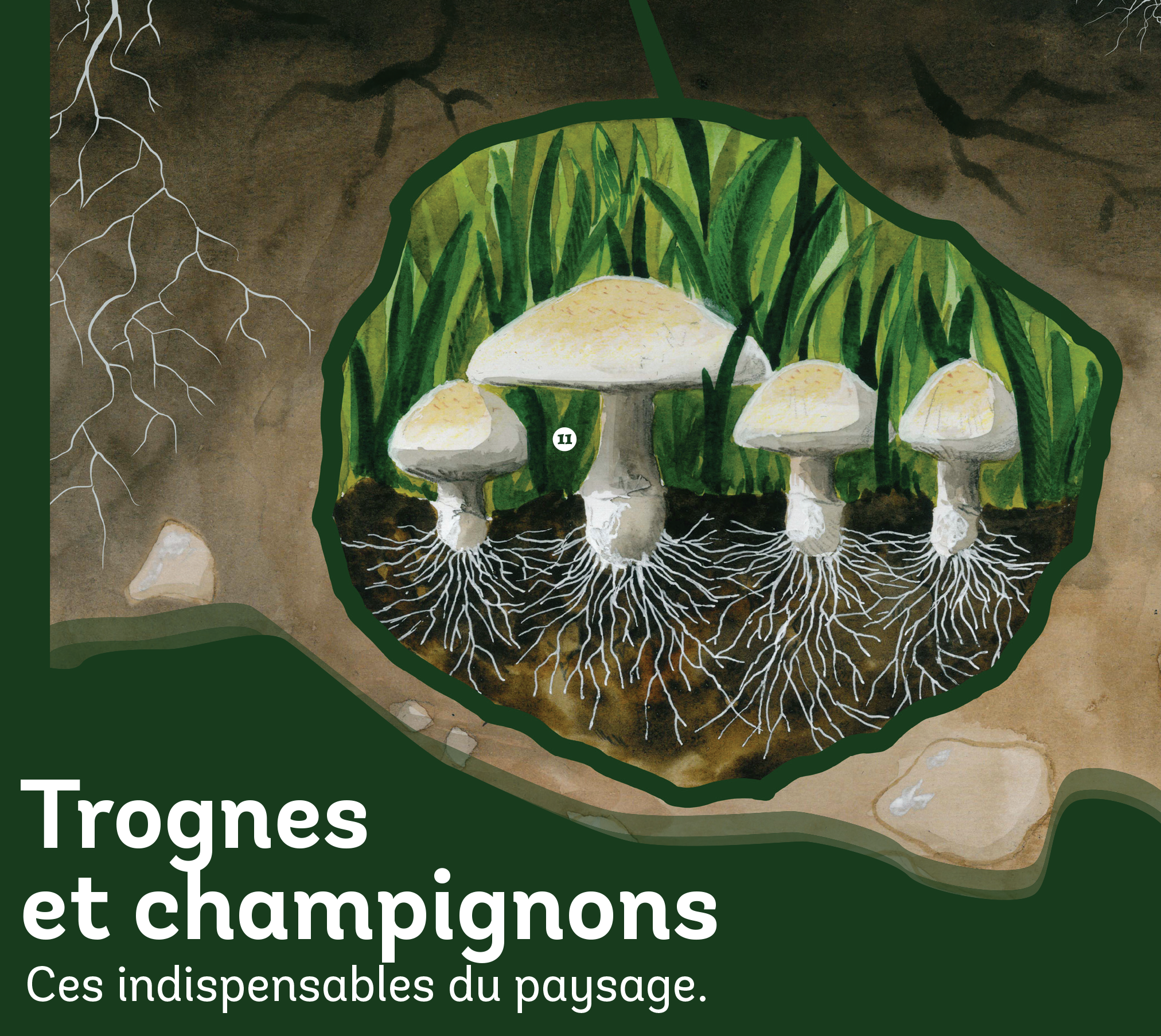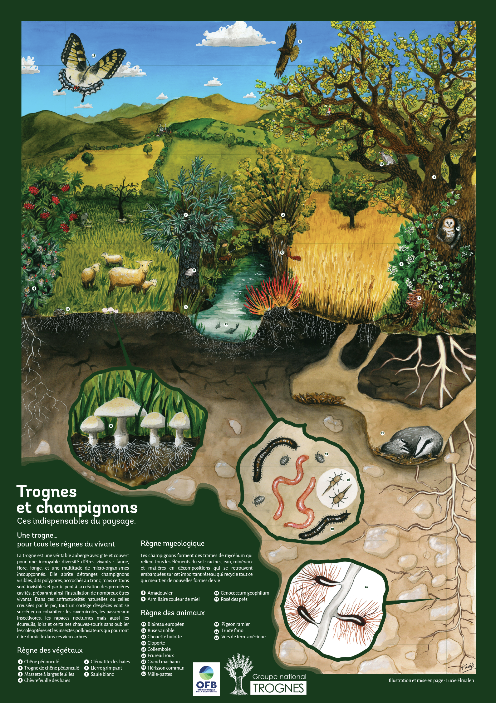 Ce projet est mené pour et en collaboration avec Arbres & Paysage 32 dans le cadre de la future publication d'un livre sur la santé des sols. Le poster propose une vision en 2 parties de la richesse de la biodiversité : Une partie aériènne et une partie sous-terraine. Le but est de mettre en valeur le monde caché sous terre et notament la complexité de ses intérations mycologiques.